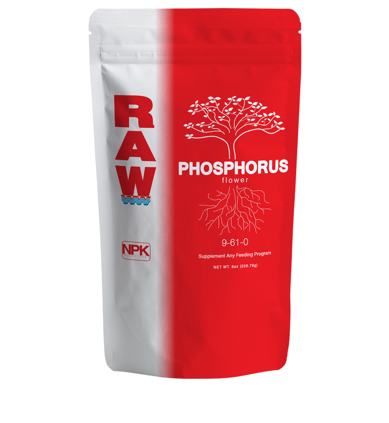 RAW Phosphorus contains 61% pure water-soluble phosphate (P). This product also contains a small amount of ammonium nitrogen (9%), which plants can utilize during bloom stage. Phosphorus is particularly beneficial during the early rooting stage, but also provides energy during fruit and flower production. RAW Phosphorus is ideal for boosting phosphorus (P) levels, treating deficiencies and creating optimal recipe solutions. A 2 oz package of RAW Phosphorus makes up to 200 gallons, an 8 oz package makes up to 800 gallons and a 2 lb package makes up to 3200 gallons.