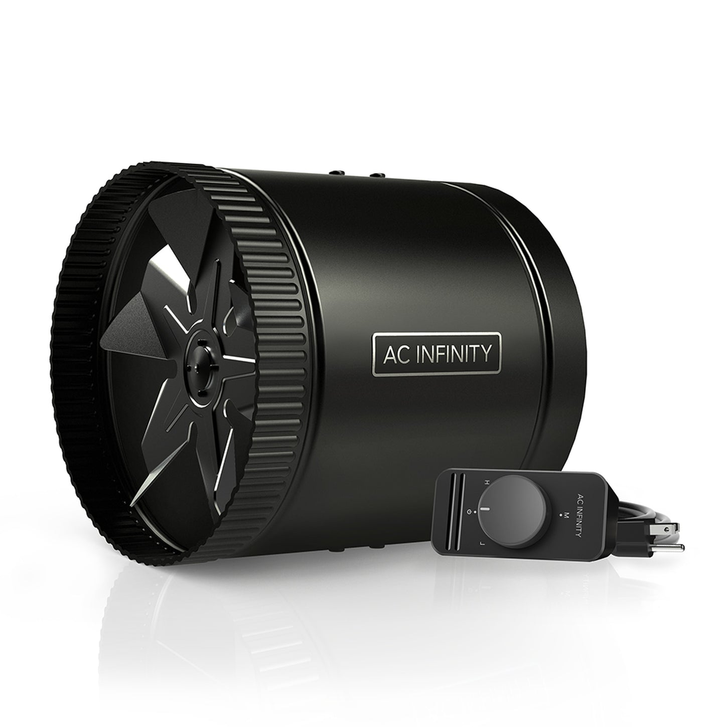 An inline fan for duct boosting designed to improve airflow in heating and air conditioning applications, and ventilate home rooms like attics, workshops, bathrooms, and kitchens. Each fan uses an easy-to-use knob controller that adjusts fan speed for your specific airflow boosting needs. It features a unibody framework that helps reduce vibration and ensures smooth and low-resistant airflow. The matte black steel cylinder is fluted and ridged for easy and secure installation in-between ducting. Its balanced steel blades have a 67,000-hour lifespan and spin using permanently lubricated dual-ball bearings to eliminate regular maintenance. The dual ball bearings also allow this fan system to be mounted horizontally or vertically. This kit includes one AC powered inline booster duct fan, a speed controller with a power plug, mounting screws, and a cable management set.